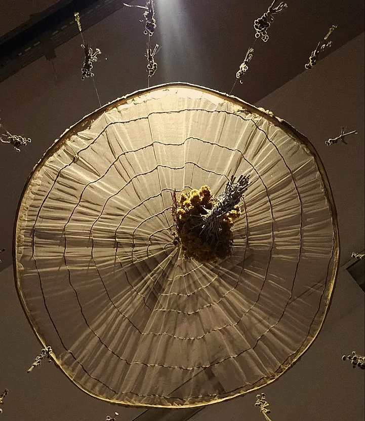 A afirmação do artista sobre “memórias de saberes manuais” talvez seja de maior interesse. Quando seguimos nesse caminho, podemos pensar na articulação de uma subjetividade artística porosa, atravessada por forças que excedem o individual. Esse é um posicionamento que contrasta com noções modernas de autoria, centradas na originalidade individual do gênio criador. Logo, não devemos estranhar que muitas das peças apresentadas, como os lustres dos quais pendem penas de arara e mutum, os móbiles, o mosqueiro e a costura do vestido de noiva de retalhos, tenham surdido do fazer de várias mãos. Contudo, a formulação permanece suficientemente vaga para não comprometer o artista com referências concretas que poderiam ser objeto de contestação ou que demandariam respostas diretas.