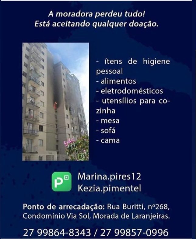 Nos momentos mais difíceis é que as pessoas percebem a força do solidariedade. Rosana Maria da Silva, fisioterapeuta intensivista, que faz parte da equipe de saúde na linha de frente do tratamento ao Covid-19 nos hospitais Doutor Jayme Santos Neves e Dório Silva, se não bastasse a tensão do momento viu-se no desespero de perder todas as suas coisas durante incêndio em seu apartamento, em prédio localizado em Morada de Laranjeiras, na Serra.