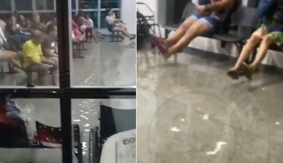 Pacientes que aguardavam atendimento na recepção tiveram de ficar com os pés dentro d’água. Moradores que estavam no local registraram vídeos que mostram a situação na unidade. Veja:
