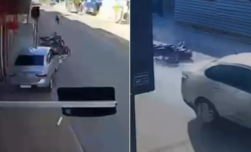 Imagens de videomonitoramento mostram o momento em que o veículo derruba uma placa de sinalização, bate em outro carro e atinge bicicletas e motos que estavam estacionadas. Após o acidente, o motorista foge do local, deixando o prejuízo para trás.