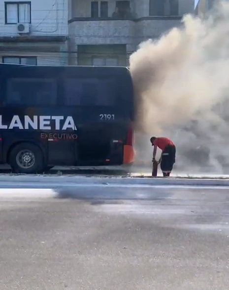 Imagens divulgadas nas redes sociais mostram uma fumaça intensa saindo da parte traseira do veículo.