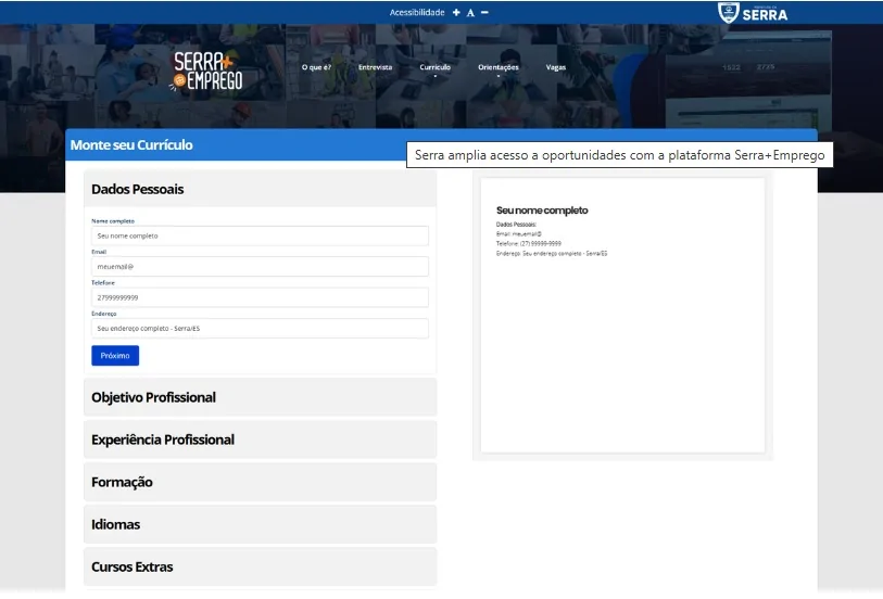 Quem está em busca de emprego na Serra pode contar com uma ferramenta digital que reúne serviços gratuitos para facilitar a entrada no mercado de trabalho. A plataforma Serra+Emprego oferece desde a criação de currículos até orientações práticas para entrevistas e encaminhamento para vagas.