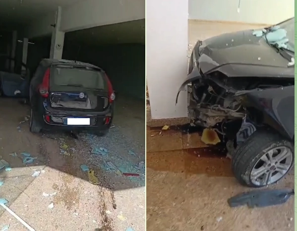 Uma câmera de segurança flagrou o momento em que o homem perde o controle da direção e vira à direita, entrando em uma loja. Por muito pouco ele não atinge um motociclista que passava no sentido contrário. Por sorte, também, a loja estava vazia e ninguém passava pela calçada. Imagens de dentro do imóvel atingido mostram o carro danificado e a porta e vidro do estabelecimento completamente destruída.