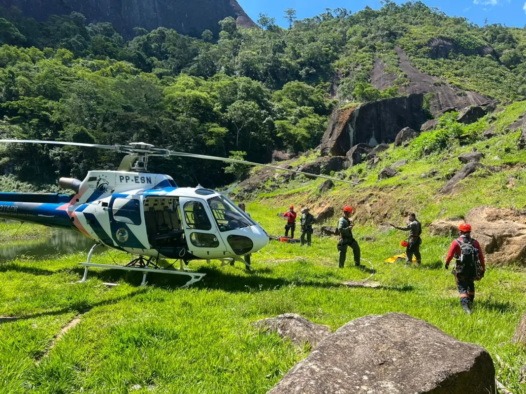 Diante da complexidade da operação, o Notaer foi acionado para realizar a extração aérea. Inicialmente, a aeronave Harpia 08 foi empregada, mas, devido às condições do terreno, não foi possível efetuar o resgate diretamente por helicóptero. Uma segunda aeronave, a Harpia 02, foi então mobilizada para transportar uma equipe especializada do Centro de Resgate em Altura do Corpo de Bombeiros, que saiu de Vitória até o local da ocorrência.