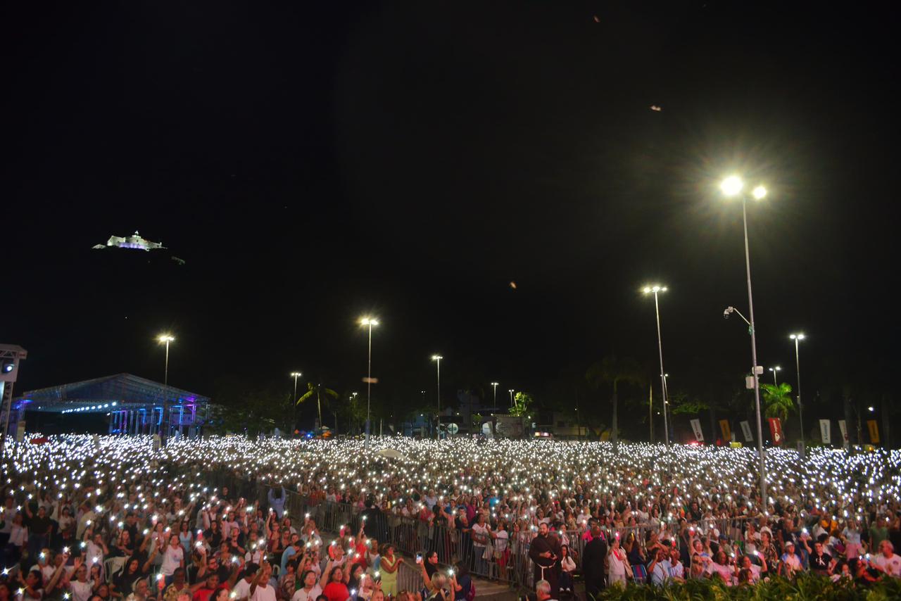 A programação teve início com um dos seus sinais mais expressivos: a subida do terço gigante no Convento da Penha, e a missa de abertura, seguida pelo acendimento da imagem iluminada de Nossa Senhora da Penha na Praia da Costa, em Vila Velha. O gesto, carregado de simbolismo, recordou que Maria aponta sempre para Cristo, luz do mundo, e inspira os fiéis a serem também luz em meio às realidades marcadas pela dor e pela divisão.