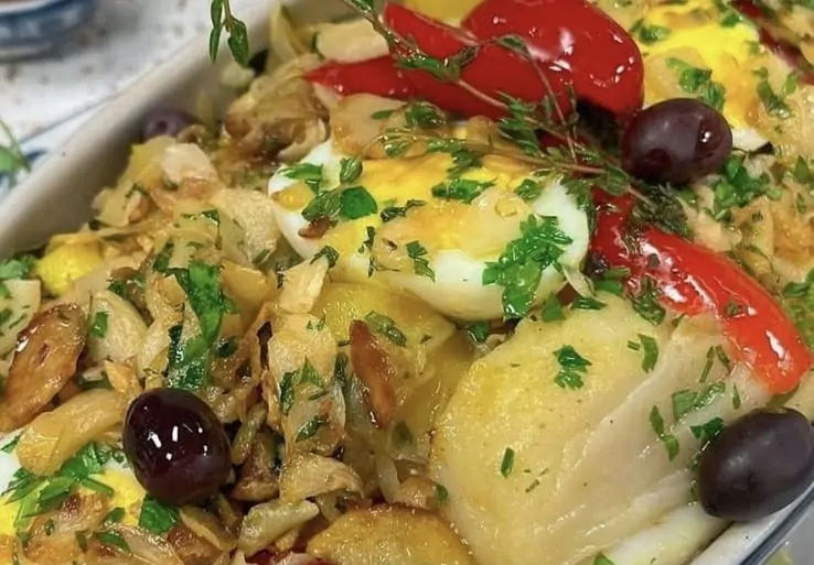 5- Em uma travessa, faça camadas intercaladas de batatas e bacalhau.