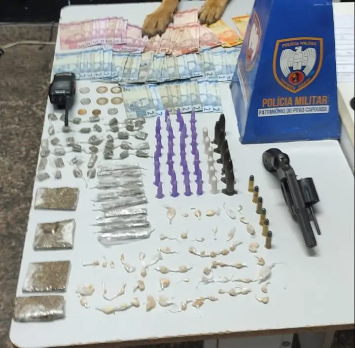Durante a busca pessoal, foram encontrados nas pochetes os seguintes itens: R$ 408,70, em espécie; 59 pedras de crack; 52 buchas de maconha; 48 pinos de cocaína e um rádio comunicador em sua mão. Além disso, nas proximidades do detido, a cadela Pandora indicou a presença de um revólver calibre .38, contendo seis munições, que estava no chão.