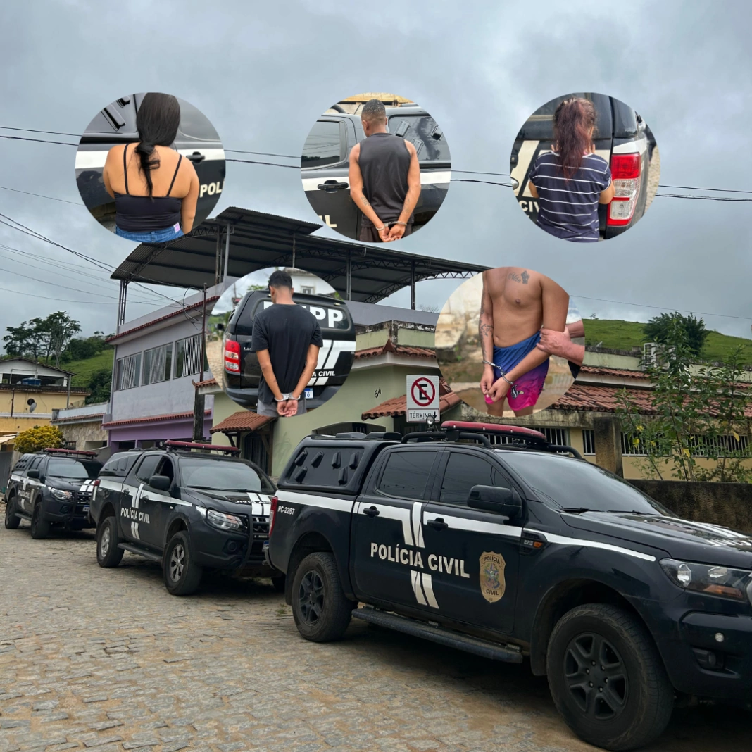 Cinco pessoas foram presas no município Apiacá, no sul do Espírito Santo, em uma investigação por tráfico de drogas, associação para o tráfico e organização criminosa. São três homens, de 18, 19 e 21 anos, e duas mulheres, de 27 e 61.