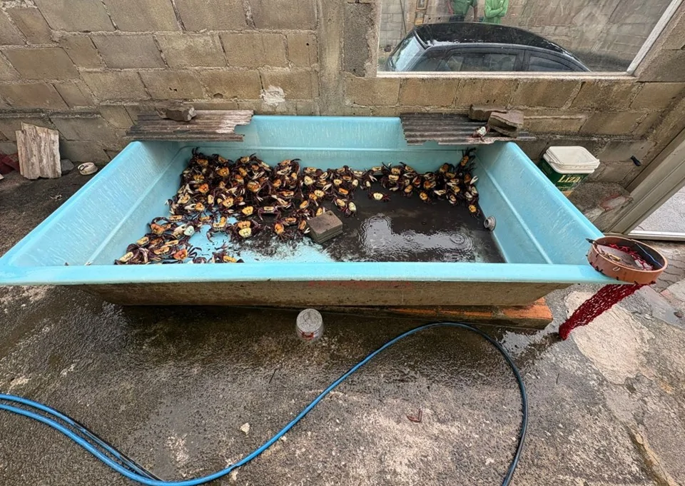 No imóvel, no pavimento inferior ocupado por um casal que se apresentou como inquilino, foram encontrados mais de cinco dúzias de caranguejos que podem ter sido capturados durante o período de defeso, quando a retirada é proibida para garantir a reprodução da espécie. Também foi localizada uma ave silvestre mantida em cativeiro sem autorização.