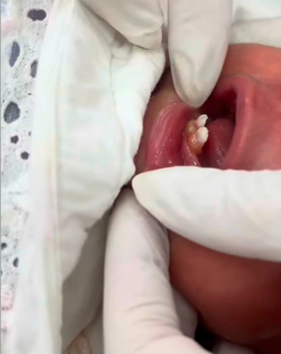 A condição é conhecida como dente neonatal, um fenômeno raro em que o bebê já nasce com um dente de leite erupcionado.
